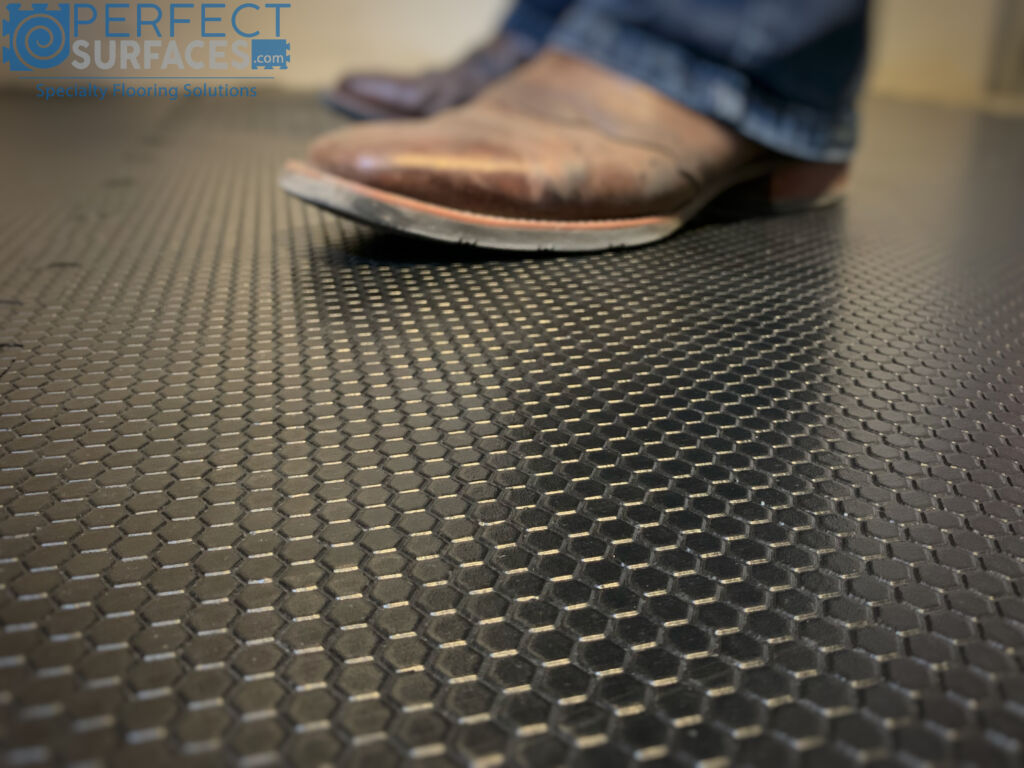 Designed for environments with high exposure to moisture, premium grade DuraRUBBER® hexagonal pattern rubber interlocking mats provide critical traction and drainage required for safety and durability. While the attractive honeycomb pattern of DuraRUBBER® rhombus tiles look great, it also provides an additional level of multidirectional grip and better traction for foot and animal traffic, reducing the risk of slips and falls- whether wet or dry. On the flipside, the aggressive treads of the FlowGRIP surface provide multidirectional drainage, allowing moisture to be channelled away beneath the surface. Due to the natural ability of rubber to prevent the growth of mildew, bacteria, and fungi, antimicrobial DuraRUBBER® interlock tiles are the healthy option for any high moisture environment. Nonporous DuraRUBBER® interlocking sheets are also easy to clean and maintain- essential in any application, from farm and ranch, to sports and fitness, to commercial and industrial applications. High quality antifatigue DuraRUBBER® interlocking rubber matting is firm enough to create a stable walkway but are also soft enough to feel good under foot- allowing DuraRUBBER® interlocking tiles to easily take on the most unforgiving environments while protecting against surface damage and still offering superior shock and sound absorption.
