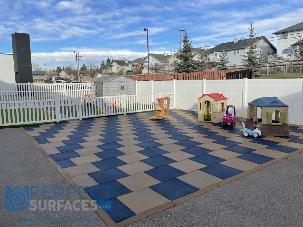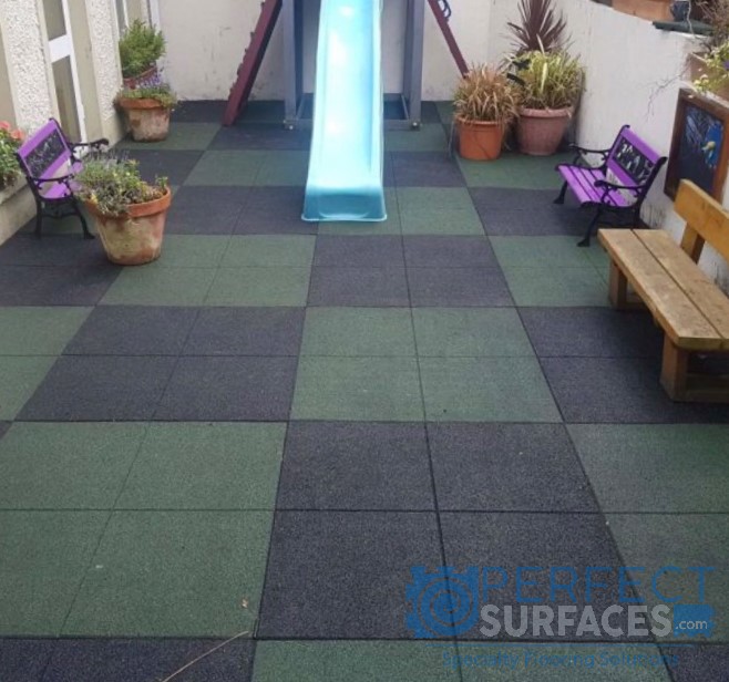 Environmentally friendly PlaySafe SHOCK recycled rubber playground tiles offer a high-impact rubber play flooring option for play areas of any size in a wide range of indoor and outdoor applications. With a variety of colours available, and a distinctive surface design that allows for square or brick installation patterns, PlaySafe SHOCK X-Connector interlocking playground tiles are a durable and attractive outdoor flooring solution for any home play area, day home or day care playground. Shock- and sound-absorbing, these rubber playground mats have anti-fatigue properties to provide a safe and comfortable play space for everyone, from babies and caregivers to active toddlers and children. PlaySafe SHOCK rubber outdoor playground flooring offers a non-slip surface, even when wet, making playtime an all-weather activity. Easy to clean and maintain, simply sweep, vacuum, or mop for indoor applications; or use a water hose, leaf blower or broom for outdoor applications.